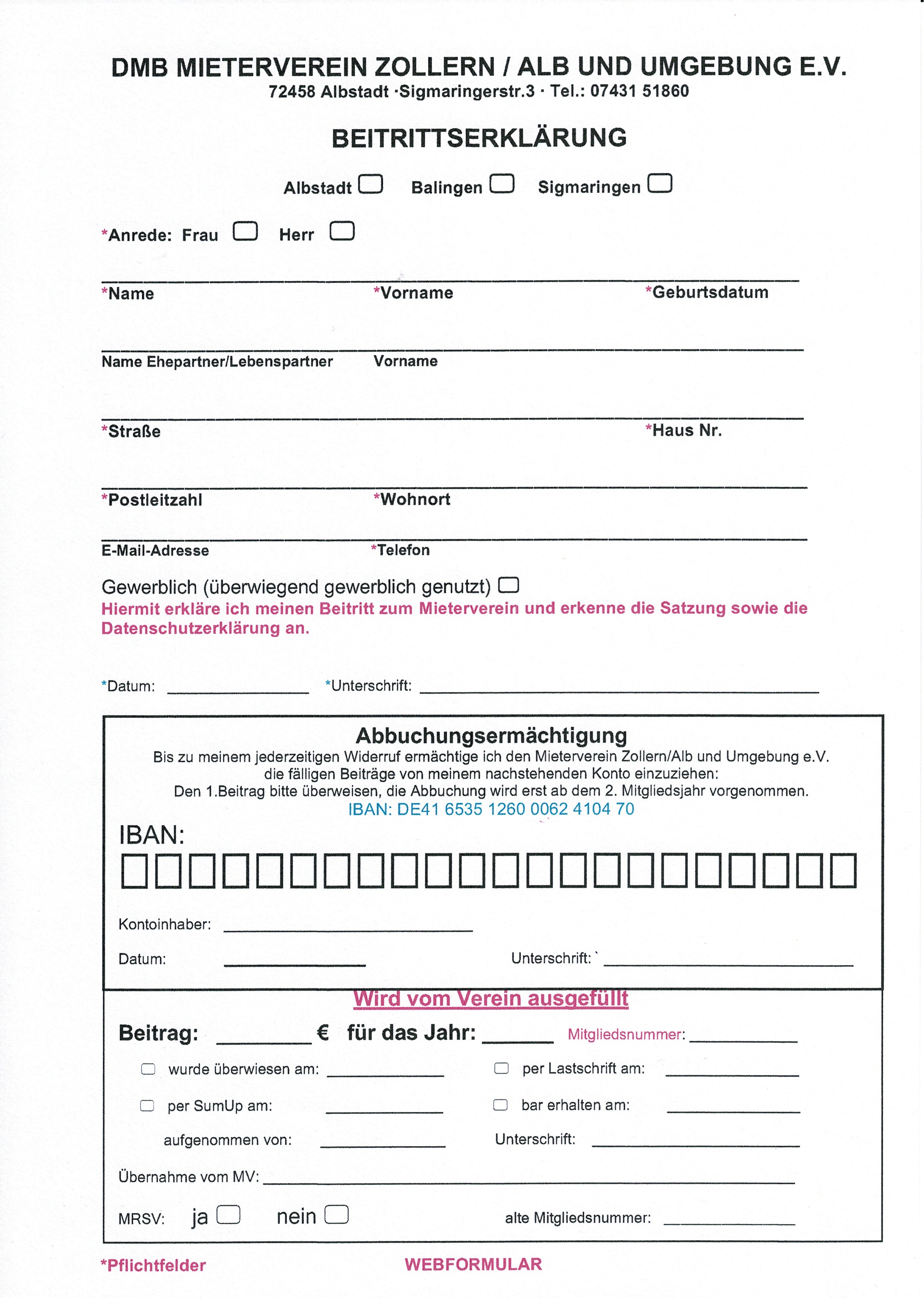 Konto: Sparkasse Zollernalb (BLZ 653 512 60) Nr. 62410470 Bitte den 1.Beitrag immer überweisen